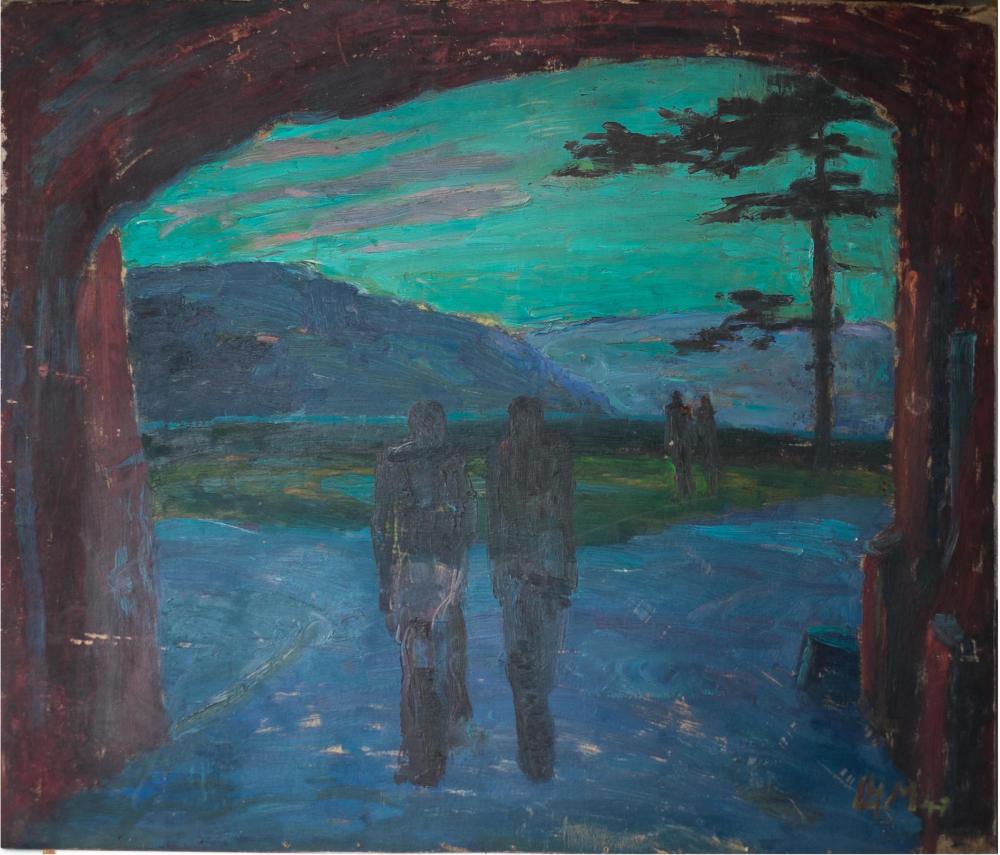 Große AnsichtSchlosshof, WV-Nr.: 0912, Malerei, 60 × 80 cm, Tempera auf Hartfaserplatte, dat.: 47, sign.: LHM